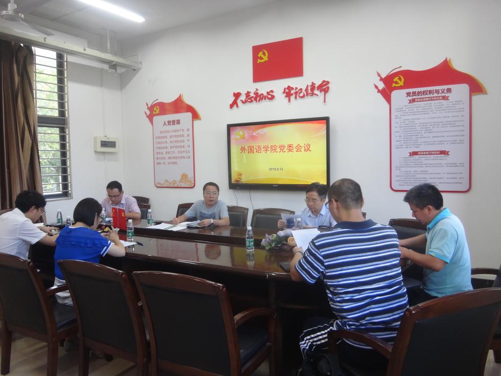 2019年9月12日下午,永利集团304am登录党委在外语楼306会议室召开“不忘初心、牢记使命”主题教育讨论会,全体党委委员和组织员参加会议,会议由学院党委书记谢友福主持。
