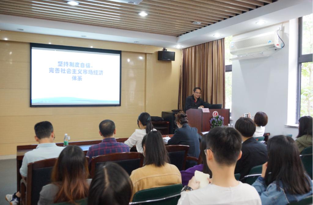 2019年11月5日下午,永利集团304am登录 “不忘初心、牢记使命”专题学习暨“我和我的祖国”主题宣讲专家报告会在外语楼207大会议室举行,“永利集团304am登录庆祝新中国成立70周年宣讲团”专家、经济与金融学院硕士生导师胡石清副教授,作题为“坚持制度自信,完善社会主义市场经济体系”的学术报告,报告会由党委委员、团委书记李莹老师主持,各教工支部书记、党委委员、学生支部书记和师生党员参加会议。