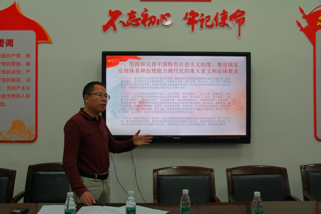 会上,谢友福书记重点解读了《中共中央关于坚持和完善中国特色社会主义制度、推进国家治理体系和治理能力现代化若干重大问题的决定》的主要精神和具体内容,他强调四中全会是我们党站在“两个一百年”奋斗目标历史交汇点上召开的一次十分重要的会议,是在新中国成立70周年之际、我国处于中华民族伟大复兴关键时期召开的一次具有开创性、里程碑意义的会议,具有十分重要的意义。要结合“不忘初心、牢记使命”主题教育,通过干部教育、党校培训、教职工政治理论学习、学生思想政治教育、支部组织生活,结合实际开展学习活动,帮助广大党员干部和师生及时准确掌握全会精神的基本内容。要把四中全会精神列入思想政治理论课教学内容,思政课程与课程思政要积极跟进,推动全会精神进教材、进课堂、进头脑。