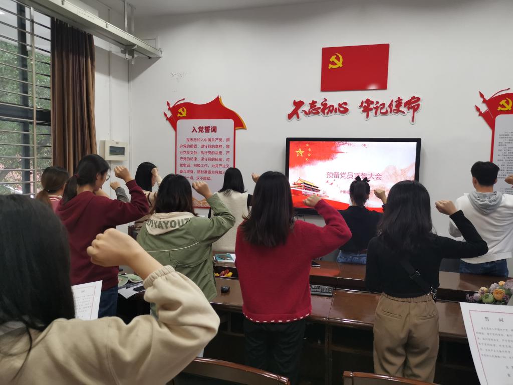 因为大部分到会的同志是大四的预备党员,正在备考研究生,因此,座谈会主要围绕考研备考和复习经验分享展开,本科生第一党支部的管会同志分享了自己备考的经验,她说,考研虽然不是越早准备越好,但一定要对自己的升学、职业等有一个整体的把握;同时要锻炼自己的学习能力,不仅是学习新知识的能力,更是适应、接受新事物的能力。本科生第二党支部的王睿同志表示,在学习考研政治的过程中,她对自己的政治基础知识点进行了查漏补缺,不断学习,了解党和国家的历史进程和思想发展,政治思想水平得到了极大的提高。本科生第三党支部的丁钰乾同志分享了自己的考研心态,他说现在最后一个月比较难熬,心态起伏也会比较大。针对丁钰乾同志提出的心态问题,研究生第二支部的樊靓学姐给出了朋辈建议,她是刚刚经历过考研,非常理解最后阶段的紧张心情,但是在这最后一个月的时间里,大家要保持心态,坚持到底,可以适当选择一些调节的活动,增加自信心。随后吴倩倩老师结合大学生的职业规划,与各位预备党员交流了专业的发展前景和自我设计,同时提出了有关考研的一些建议意见,现在外语专业的学生专业优势面临的竞争越来越激烈,我们要把外语和其他技能结合起来,实现“外语+”。最后换届为预备党员集体宣誓仪式,由吴倩倩老师领誓,全体预备党员举起右手,面对党旗,庄严宣誓。他们用誓词表达自己对党的崇高信仰和无限忠诚,以及为党的事业不懈奋斗的决心。
