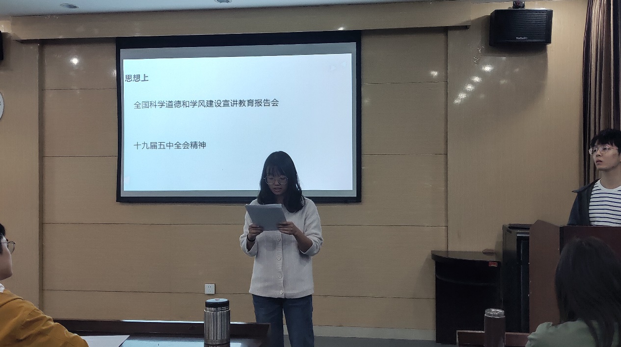 会议伊始,吴倩倩老师就十九届五中全会会议议程,详细剖析了我国发展环境面临的深刻复杂变化。其次,吴倩倩老师结合教育方面对实现“十四五规划”和二〇三五年远景目标进行了解读。她指出,国务院下发的《深化新时代教育评价改革总体方案》要求克服“五唯论”,避免高校教育变得功利和短视。当代高校的研究生应做好专业学习规划,秉持科学精神,踏踏实实做学问,安安静静搞研究,杜绝投机取巧行为。随后,吴倩倩老师强调了“十四五”时期经济社会发展指导思想和必须遵循的原则即“九个坚持”,以及“十四五”期间党和国家将重点发力的12个方面,她真心地勉励在校研究生能够合理利用好学校的学习资源和平台,努力提升自我的科研素养以及综合竞争力。