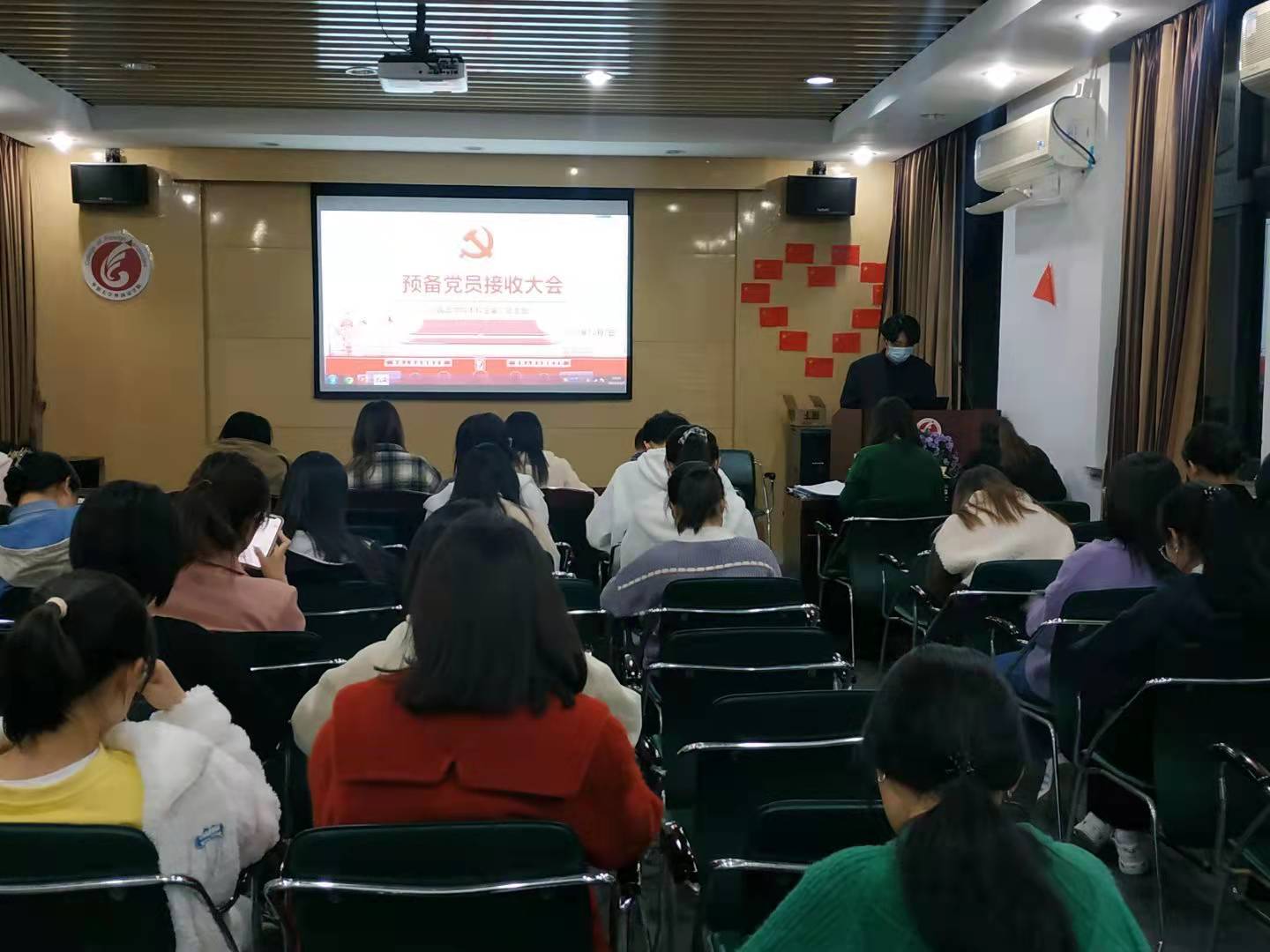 此次预备党员接收大会严格按照“三会一课”相关要求进行。首先吴倩倩老师介绍会议议程和会议纪律。随后主持人曾婷宣读此次大会计划吸收为预备党员的发展对象名单,紧接着发展对象逐个宣读入党志愿书,向党组织汇报本人对党的认识、入党动机、个人履历、家庭和主要社会关系情况、现实表现以及其他问题,两位入党介绍人分别从对发展对象的培养和考察情况向大会报告,与会党员分别对党员发展对象的生活、学习、思想各方面优缺点做出全面评价,对其转为预备党员提出意见和建议。发展对象的入党志愿真挚诚恳、严肃认真。吴霜同志关心集体、乐于奉献,积极学习马克思主义思想,用党的理论知识武装头脑,不断提高对党的认识,她说道:“中国共产党党员,不仅仅象征着崇高的荣誉,更重要的是能够为中国人民谋幸福,为中华民族谋复兴”。宋明月同志在大会上陈述了自己的入党动机。她说道:“只有中国共产党才能引导我们走向国家富强、民族复兴的道路,我想全身心投入共产主义事业中,更好地为人民服务。”最后大会采用无记名投票的方式进行表决,一致同意接收赵璇、何安琪、林泷、宋明月、吴霜、孟祥露、余倩、杨青霖8名发展对象为中共预备党员的决议。吴倩倩老师鼓励学生党员自觉提升党性修养,强化责任意识,身体力行党的要求,恪守党的纪律,每一名青年党员都要以高标准要求自己,加强组织性、纪律性,明确学习工作目标,同时也表达了对新发展的预备党员的期望,希望他们能够牢记使命担当,做好模范带头作用。