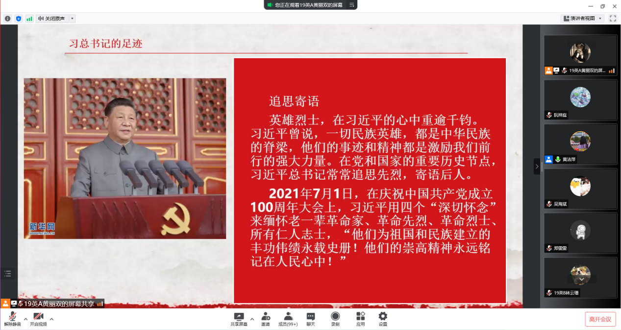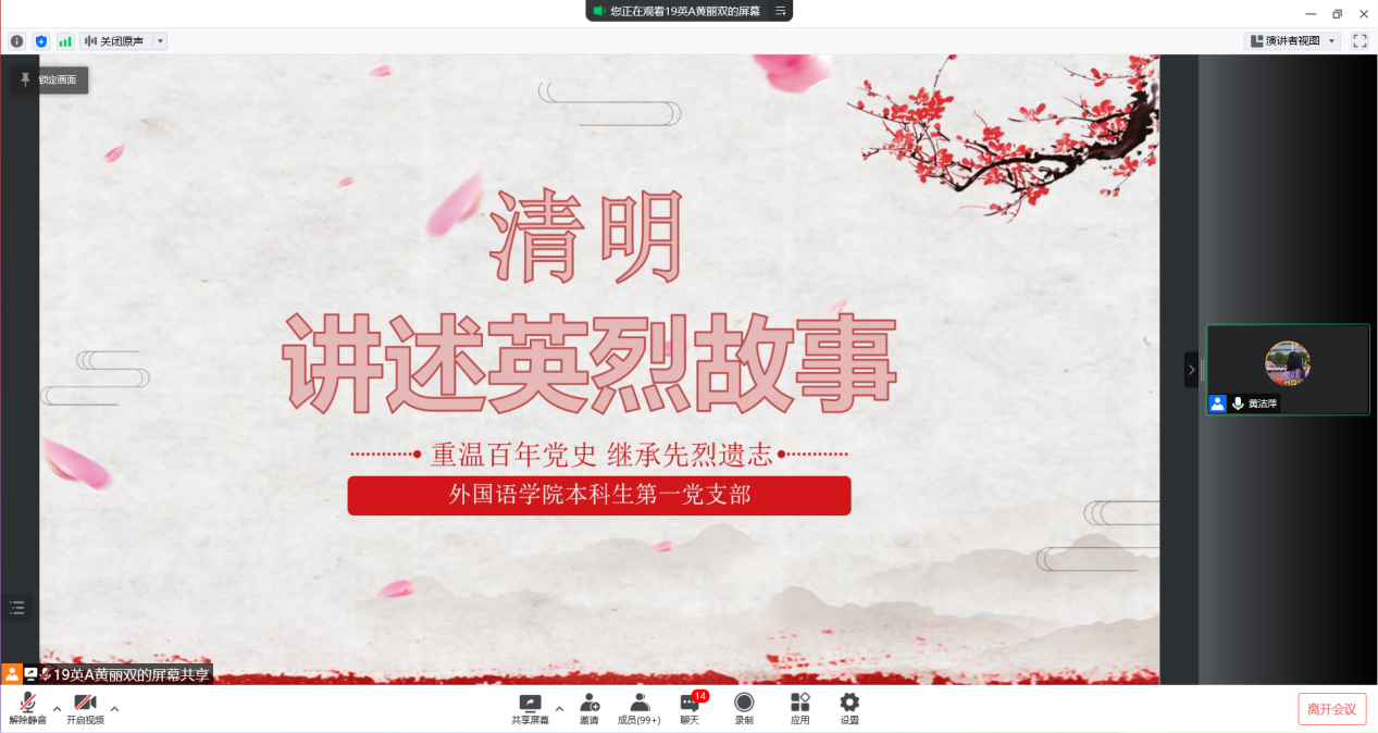 党支部书记黄洁萍老师总结了此次会议内容,肯定了支部成员在近日疫情防控中体现出的青年担当同样是学习先烈奉献精神和奋斗精神的体现,并分享对“肖思远的弟弟,报名参军”这一热点话题的触动,呼吁支部全体成员度己之力,做好中国新一代的希望。之后,支部成员纷纷发言,表达了自己对“清明节”、“先烈”、“民族精神”、“时代精神”等的认知。