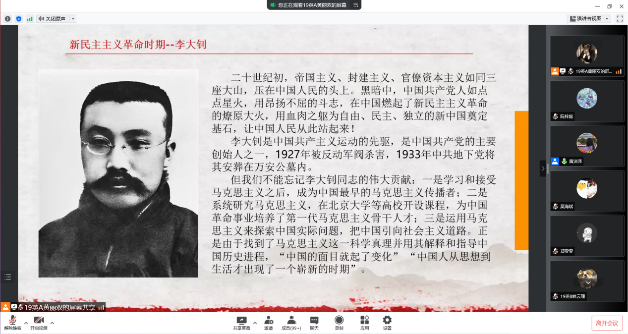继而,会议着眼党的百年征程中伟人先烈,分享以新民主主义革命时期的李大钊、社会主义革命和建设时期的李云祥、改革开放和社会主义现代化建设新时期的王伟、中国特色社会主义新时代的陈祥榕为代表的奋斗事迹。