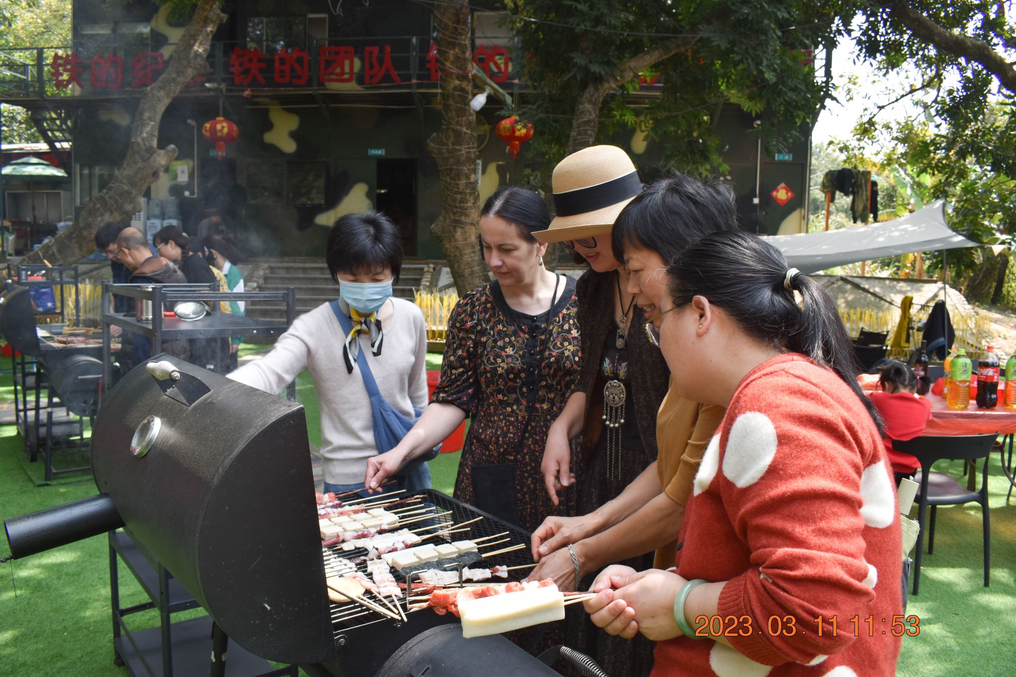 到中午饭点,女教工们自己动手烧烤。烤炉上五花肉,烤羊肉,滋滋冒油,香气四溢,诱人味蕾;还有烤鱿鱼,烤玉米等丰富的食材,再配上特色面线糊,令人胃口大开。大家边吃边聊边笑,尽情享受美食和动手烧烤的乐趣。