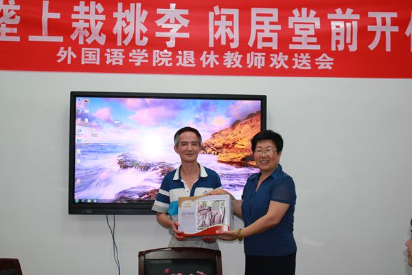 学校人事处侯丽京副处长代表学校赠送退休纪念品
