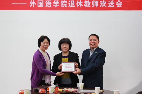 欢送会上,学院领导为光荣退休的老师颁发了镌刻着“滋兰九畹,树蕙百亩”的专题纪念匾并合影留念。