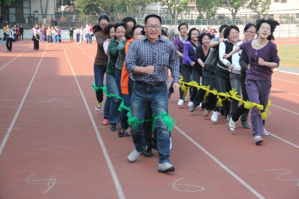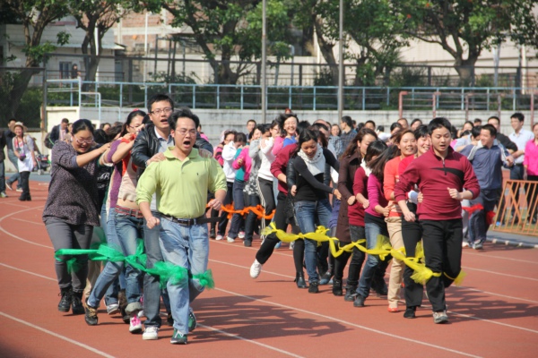 本次活动采取分组赛,每队由八名女教职工和两名男教职工组成。参赛人员一字排列,用绸带绑缚双腿,形成一条十人的长队,因此也被称为“蜈蚣赛”。整个比赛现场热闹非凡,场面精彩而激烈,各队成员团结协作,努力争先。永利集团304am登录选派的外国语一队以绝对优势获泉州校区一等奖。泉州外语二队获得三等奖,厦门外语一队也同样奋力拼搏,取得好成绩。