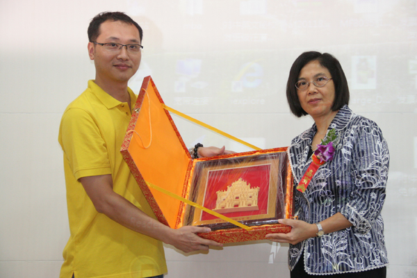 澳门校友会会长林辉莲(右)向厦门校友会外语分部赠送纪念品