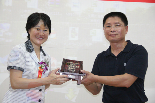 党委副书记朱琦环(左)为捐赠学校50周庆典的校友颁发纪念奖牌