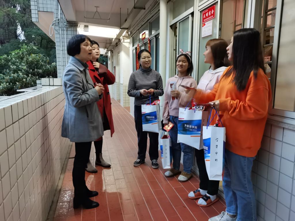 2021年寒假我院共有7名同学留校,李璐岚一行逐个宿舍进行走访,在交谈过程中,李书记询问同学留校这段时间的学习生活情况,嘱咐大家正确对待疫情,保持良好心态,有任何困难和问题及时联系学院及辅导员。她还亲切提醒大家,近期天气转凉,要注意保暖,保重身体。李书记表示,大家在学校过年不孤单,身边陪伴着很多同学和老师,她希望大家在学校能像在家里一样,开开心心迎接新年。