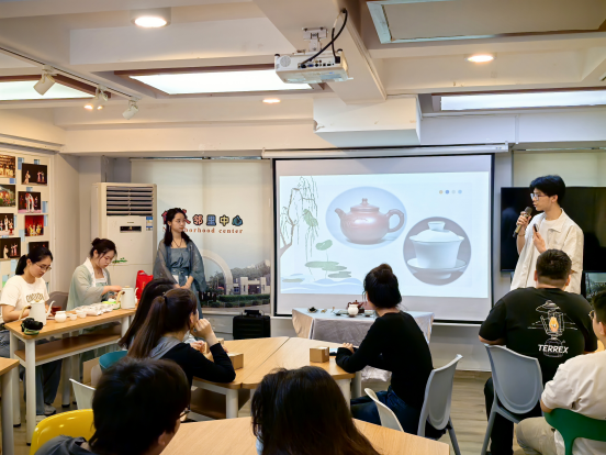 活动伊始,香港学生黎绍聪通过有奖竞答环节开启茶文化学习之旅,生动讲述了中国茶文化的发展历程、工夫茶的起源及其蕴含的待客哲学,让在场师生深刻感受到礼仪之邦的文化底蕴。随后,茶艺汉服展演队的同学们身着传统服饰,以优雅的动作展示了盖碗和紫砂壶的泡饮流程。盖碗表演中"三才碗"象征"天地人"和谐共生,紫砂壶演绎时"关公巡城"展现中华待客之道,让现场观众在欣赏优美茶艺的同时感悟静心养性之道。随后的茶艺体验环节中,境内外各民族学子在展演队同学的指导下亲身体验泡茶、饮茶,感受茶道养生之道。