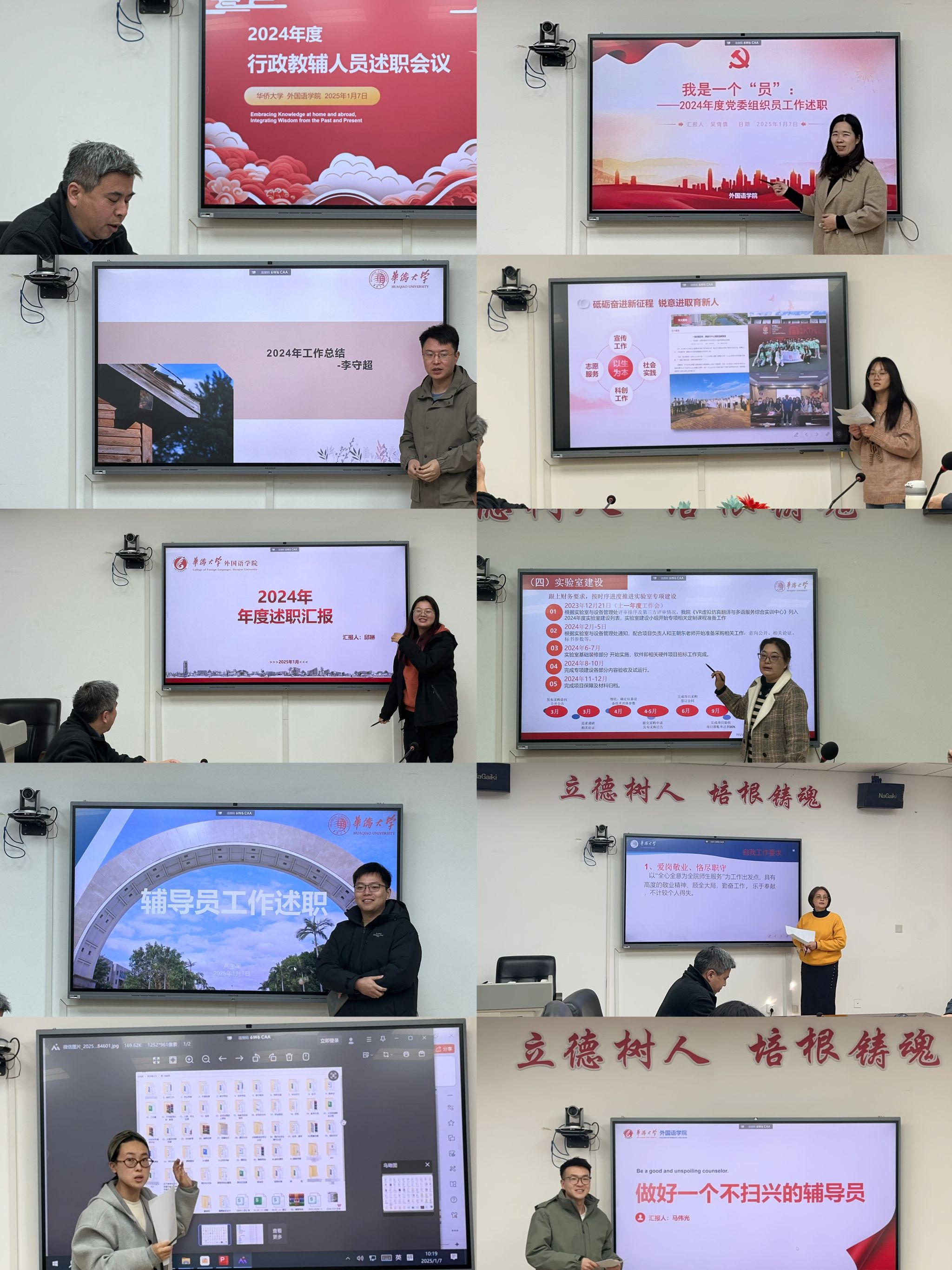 会上,行政人员依据各自职责分工,围绕2024年度工作成效、存在的问题与不足及未来改进措施等方面,进行了全面而细致的述职汇报。述职内容涵盖了党务工作、教学管理、学生管理、学科科研、团委工作、社会服务、实验室建设、工会工作、办公室日常管理等各个方面,通过生动具体的实例和各类详细的数据,充分展现了学院行政教辅团队在过去一年中的工作成效和不懈努力,内容既丰富又全面。