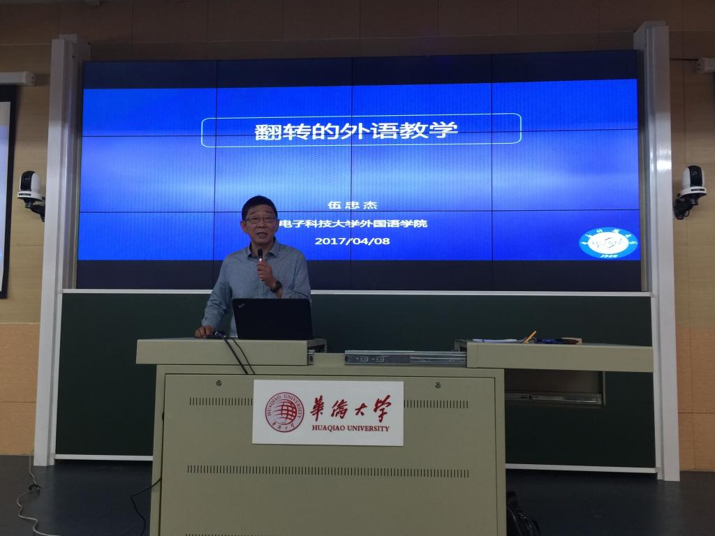 为更好地促进多媒体与信息技术在我校外语课堂教学中的有效应用,指导教师进一步创新教学模式和教学方法,实现新一轮大学英语教学改革中信息技术与教学内容的深度融合,2017年4月8日,由永利集团304am登录教师发展中心与永利集团304am登录联合举办,永利集团304am登录大学英语部承办的永利集团304am登录“教学工作坊”之《翻转课堂与微课制作》主题讲座在泉州校区荷风直播教室成功举办。此次讲座邀请电子科技大学永利集团304am登录伍忠杰教授主讲,永利集团304am登录谢友福书记、校教师发展中心陈海蛟副主任、永利集团304am登录杜志卿副院长以及外国语院全体教师出席了此次讲座。