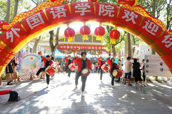 走进外院迎新现场,由日语五十音图和英语二十六字母组成的红包墙吸引了大批新生参与。红包内放有用英语和日语撰写的人生格言卡片、学院领导新学期寄语以及抵用券等,让新生在获得小惊喜的同时感受学院的温暖。以中国地图为背景的签名墙新颖别致,新生纷纷在签名墙上签下自己的名字,象征着正式加入外院这一温暖大家庭。此外,迎新现场还悬挂着万国旗,独具异国风情,彰显外院特色。鼓声正浓,外院的中琉太鼓队鼓点铿锵,太鼓源于日本,被外院学子倾情演绎,独具感染力,吸引了众多家长驻足观赏,成为了华园大道上别具一格的靓丽景致。