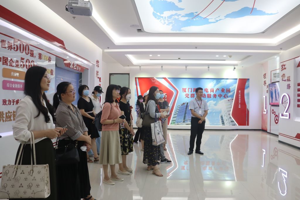 党员教师们首先参观了象屿文化空间,在解说员的带领下,全面地了解了象屿集团的发展历史、投资领域、经营成果、党组织建设等情况,以及企业发展历程、多元化经营版图、企业价值文化等,其中特别参观学习了象屿集团特色党建工作模式,并就党建工作开展了交流座谈会。象屿集团将经营管理、团队建设、文化传播等工作作为党组织工作的突破口,打造“一强四联”党建品牌,发挥象屿国企党建优势和资源优势,通过跨境电商产业园的资源联动与入驻企业紧密联系在一起,组织联建、事务联商、资源联享、活动联办,实现“党建促经营、企业共发展”。