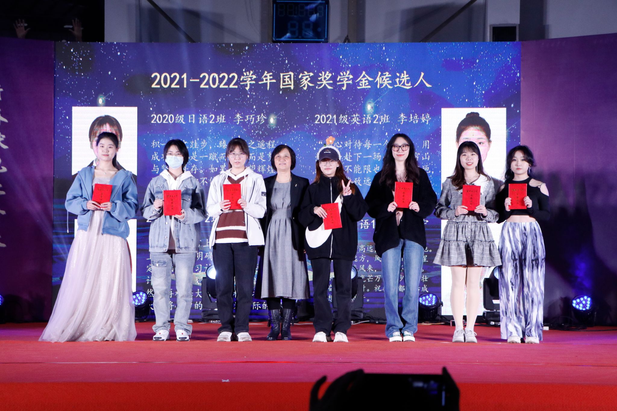 使命呼唤担当,榜样引领时代。在节目表演环节中间进行的是学院的年度表彰大会,学院对在过去一学年中学习成绩优异、学科竞赛中表现突出的团队和个人进行表彰。依次分别对国家奖学金、国家励志奖学金、青山励志奖学金、校级一二等奖学金等获奖代表进行表彰,对在外语类学科竞赛中获奖选手进行嘉奖。