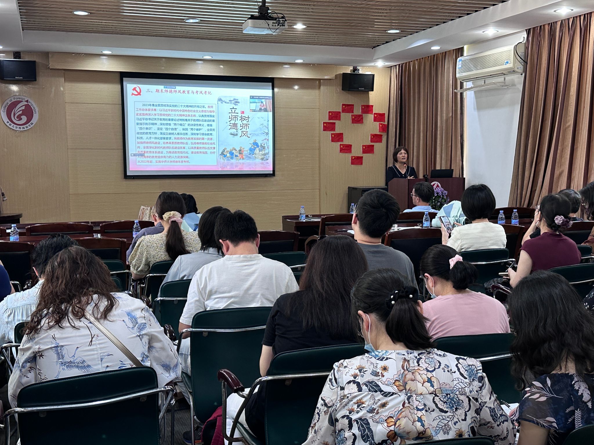 紧接着,李璐岚书记以“加强师德师风建设,培养高素质教师队伍”为主题,向全体教职员工传达了我校师德师风建设有关文件精神,鼓励大家向优秀致敬,向先进学习,学习从教三十周年几位教师的优秀品质,端正师德师风,养成终身学习习惯;不断提升专业素养,积极投身各项工作,为促进学校高质量发展做出贡献。