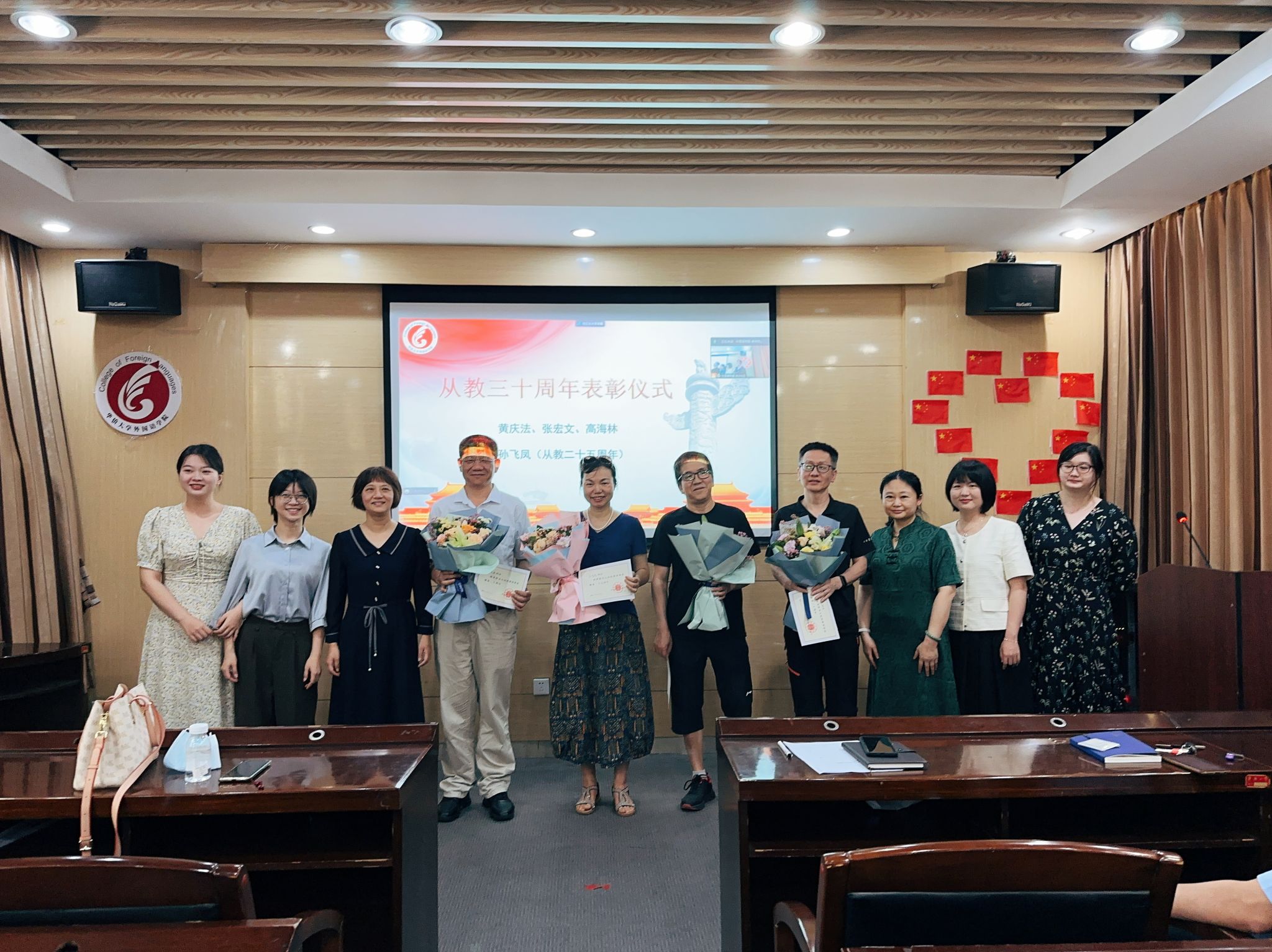 首先,举行表彰仪式,李璐岚书记宣读表彰从教三十周年教师名单,与朱琳副院长分别为黄庆法、孙飞凤、张宏文和高海林4位老师颁发荣誉证书,由学院新进青年教师为他们献上鲜花,表达敬意和传承,并合影留念。“从教30年”是教师生涯中一个光荣的里程碑,李璐岚代表学院向受表彰教师表达敬意,教育事业崇高而伟大,教师职业光荣而神圣,恰逢新时代、新思想、新机遇、新征程,希望大家在从教三十年的新起点和新征途上,一如既往的厚植爱国情怀、涵养高尚师德,也勉励广大青年教师要做心怀“国之大者”的大先生,志存高远、敬业奉献,并将这种精神传承下去,在年轻教师身上发扬光大。接着受表彰的教师逐一讲话,回顾过往,他们结合自己的教育生涯回顾了来校工作以来发生的变化和自己成长的足迹,表达了对学院培养的感激之情和对学校未来发展的期望,也勉励青年教师加强学习、提升个人修为和科研能力,为学校发展和实现个人价值而奋斗。