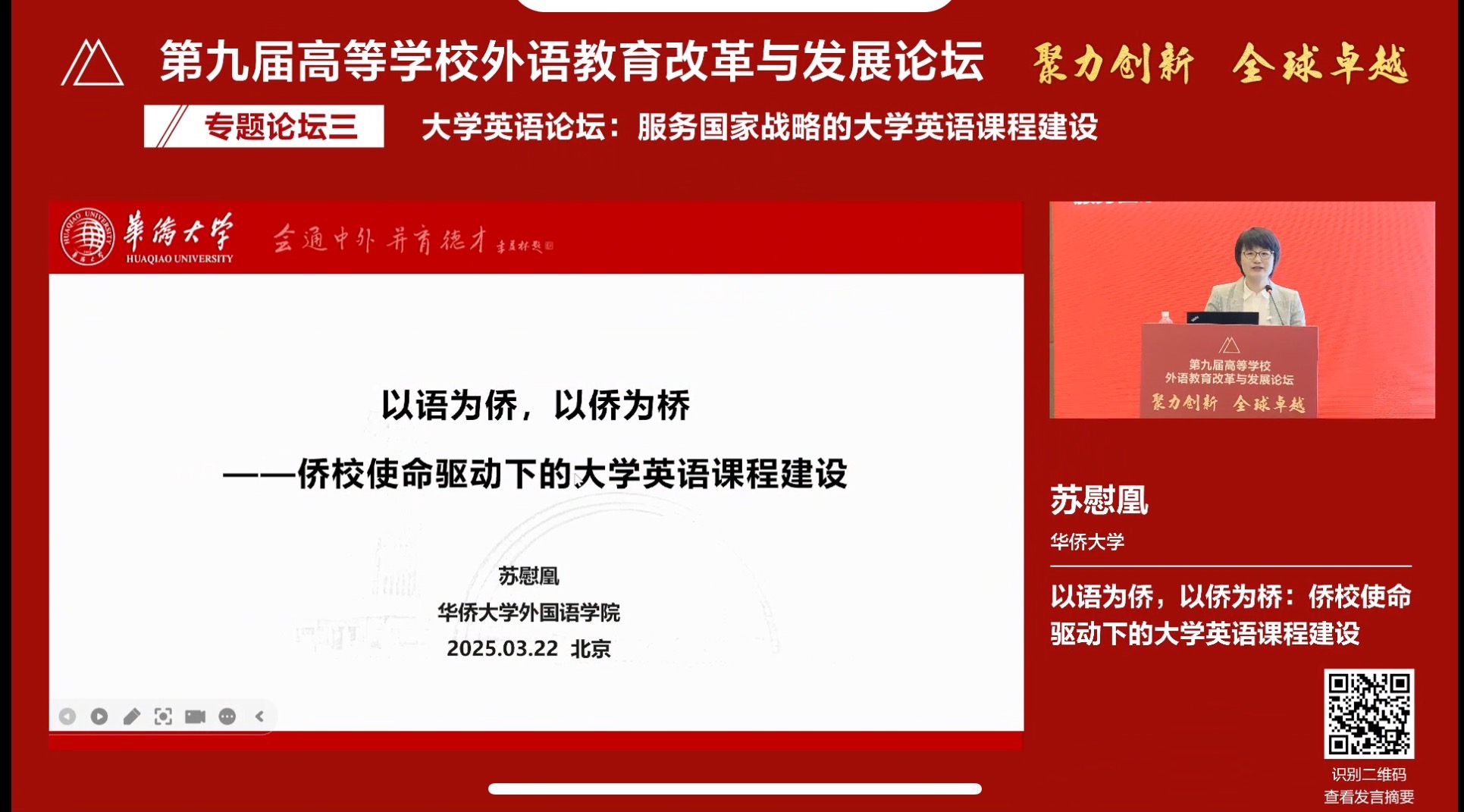 永利集团304am登录院长助理苏慰凰副教授应邀出席论坛,并在“服务国家战略的大学英语课程建设”专题论坛上,作题为“以语为侨,以侨为桥:侨校使命驱动下的大学英语课程建设”的报告。